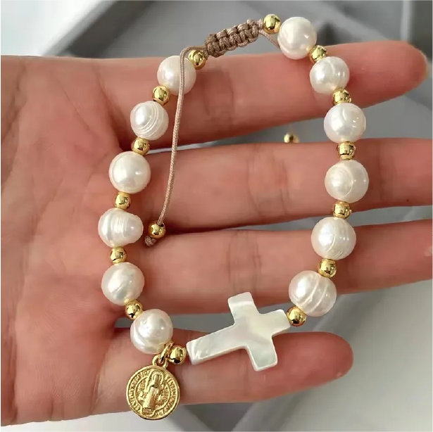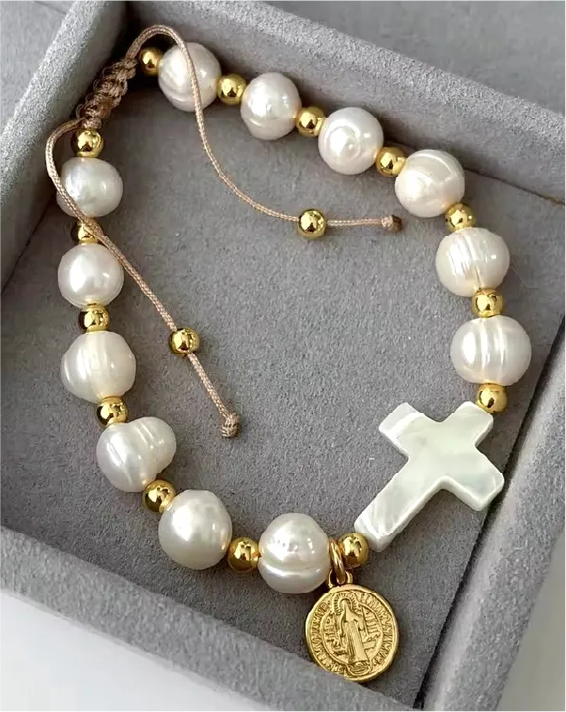 Pulsera de perlas cultivadas con una cruz de nacar y la medalla de san benito.