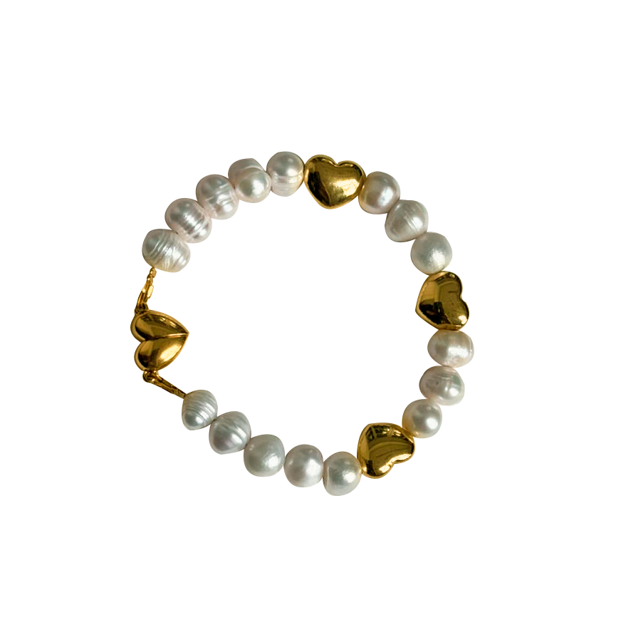 Pulsera de perlas cultivadas con corazón de acero con baño en oro de 18K. Cierre de Imán.