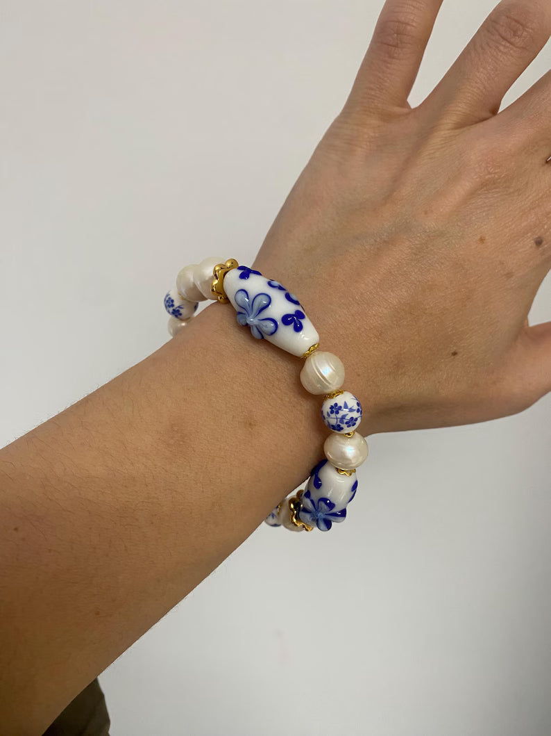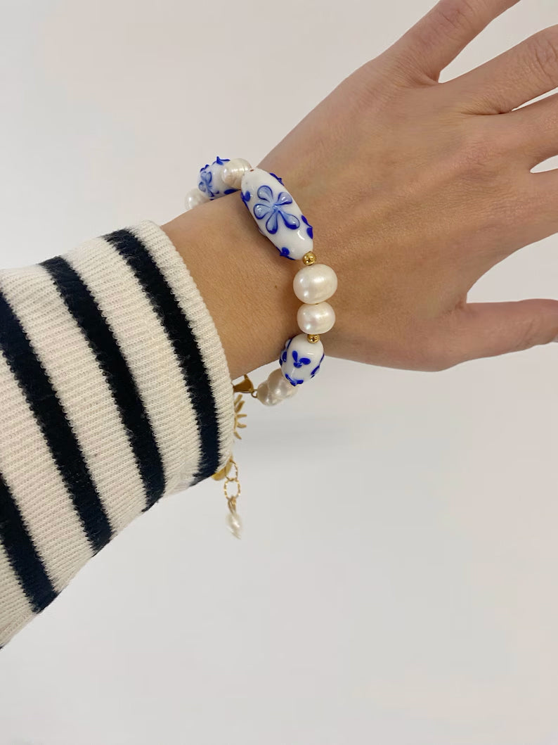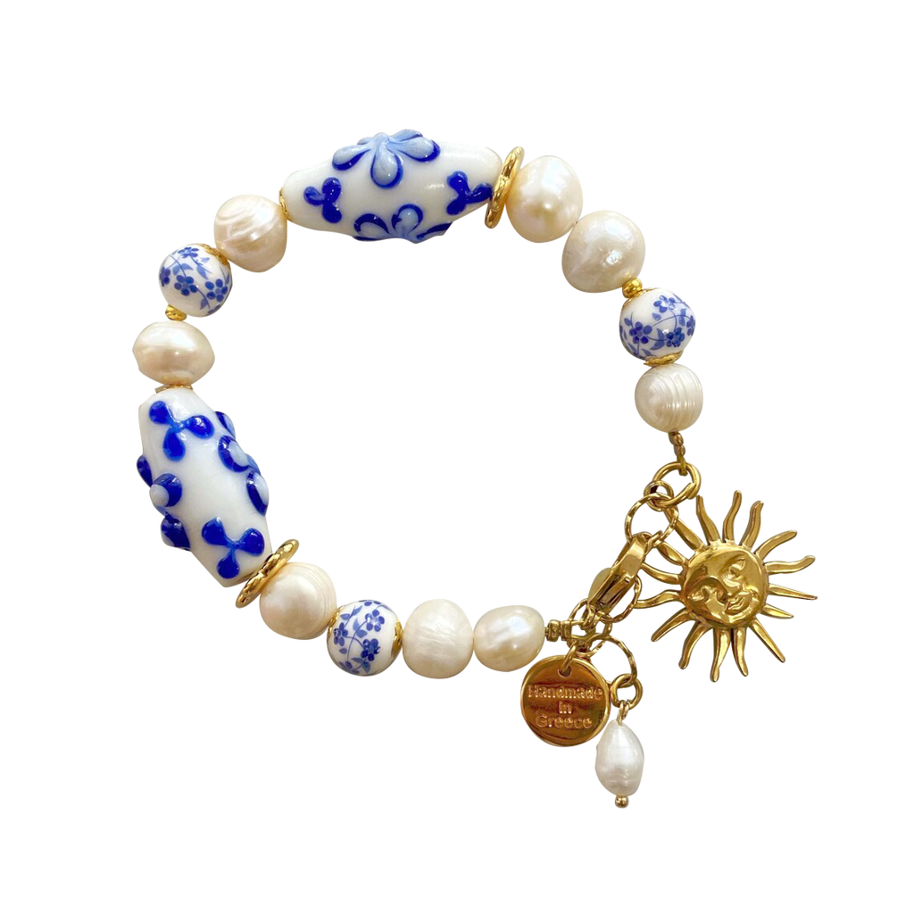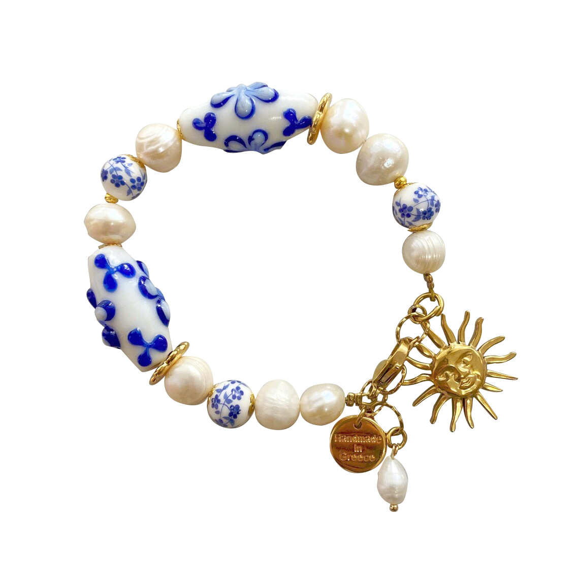 Pulsera de perlas cultivadas con dije de sol de acero con bano en oro de 18K