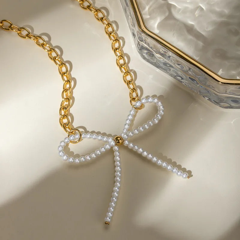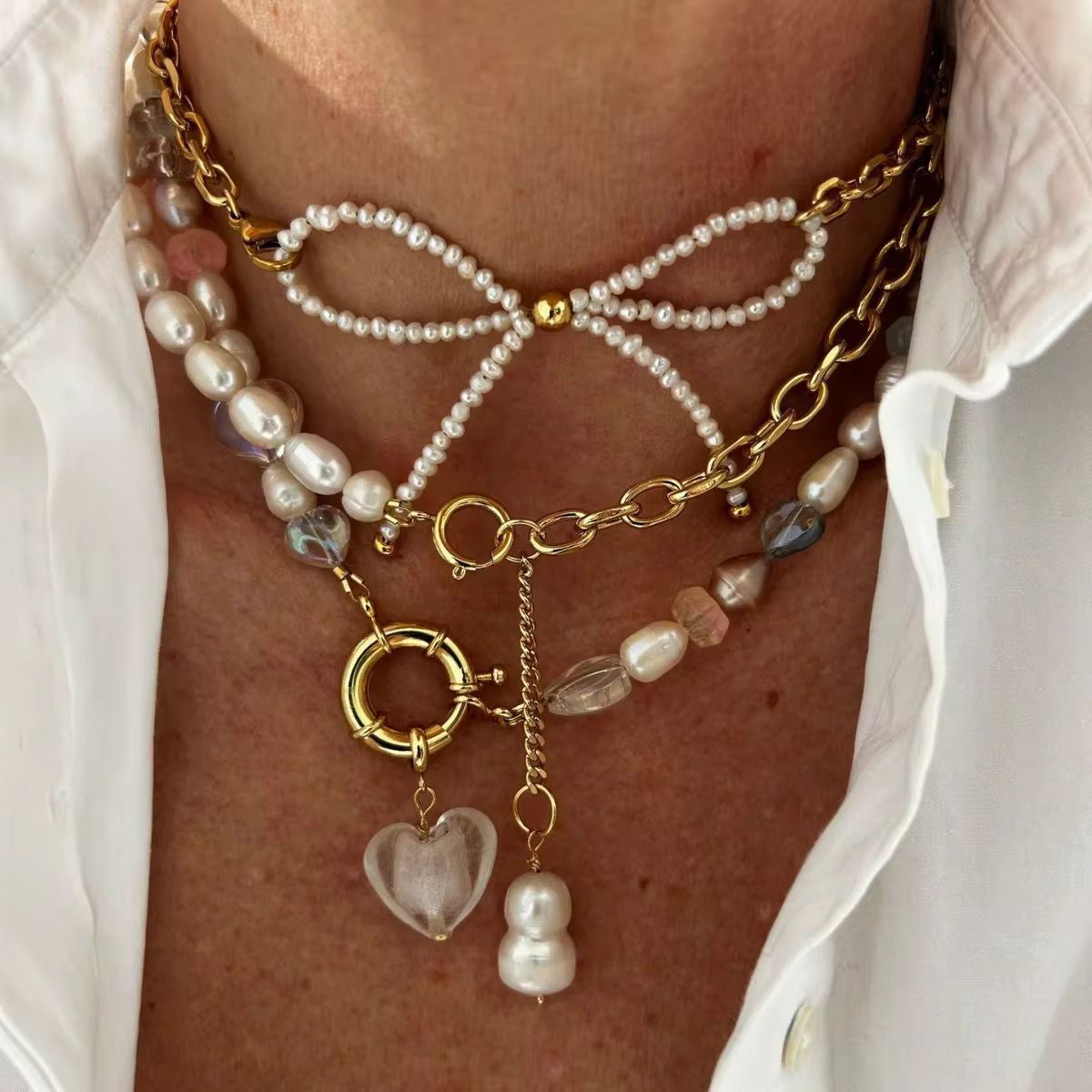 Collar de perlas cultivadas en forma de lazo. Cadenita de acero inoxidable con bano en oro de 18K.