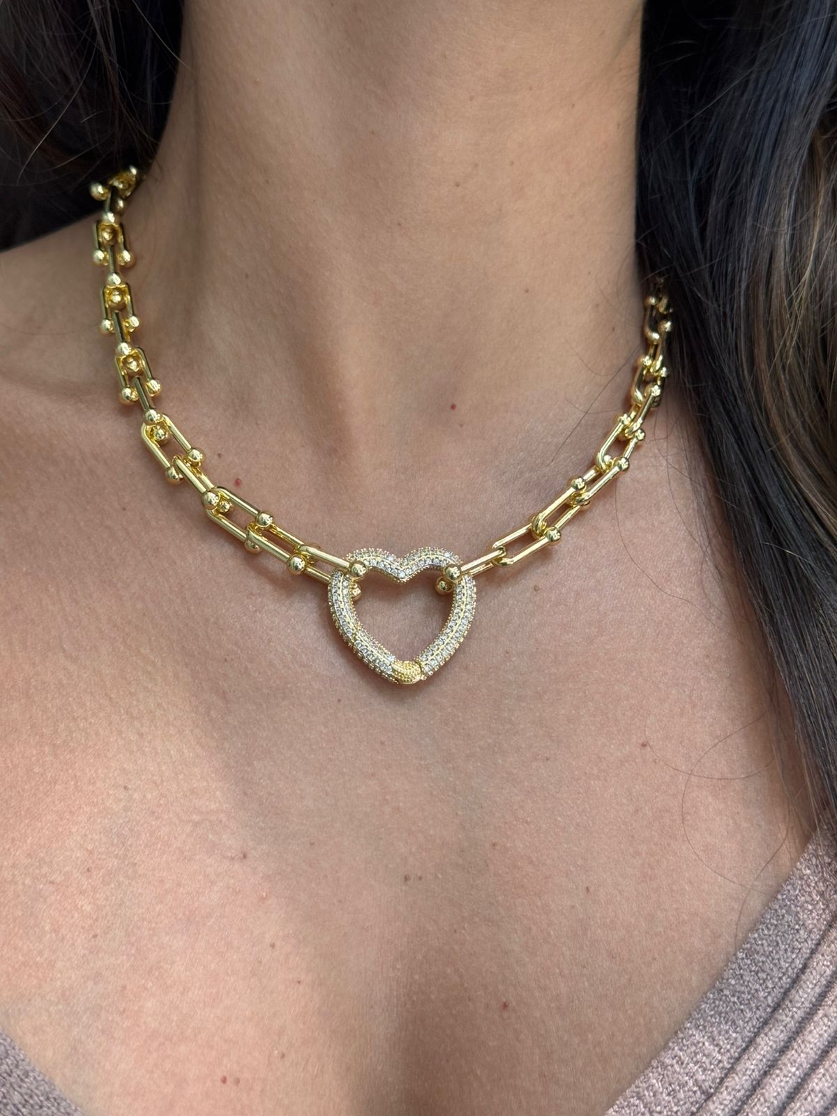 Collar de acero inoxidable bañado en oro de 18K con dije que se abre en forma de corazon.